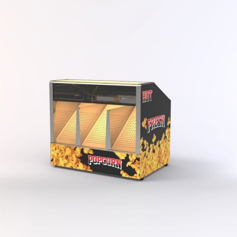 For at holde popcornene friske under filmen bruger biografer ofte et opvarmet vitrineskab til bordpladen for at opretholde dets temperatur og fugtighed. Bordpladens opvarmede vitrineskab, normalt lavet af metal eller plastik, er isoleret for at reducere varmetabet og derved opretholde temperaturen og fugtigheden af popcornene.